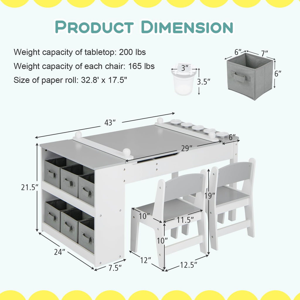 This unique 3-in-1 kids art table and art easel set has a lift-able tabletop, which allows you to transform the table to a kids art easel. The tabletop is lifted by a durable hydraulic rod, which brings slow lowering for safety. The cutout handle also protects your little one from accidental injuries. This art station offers lots of storage options for various supplies, including spacious tabletop, hidden storage compartments under the tabletop, 6 removable fabric bins with handles on 2 shelves and 5 paint cups. Made of sturdy MDF, the table can hold up to 200 lbs, while the chairs can hold up to 165 lbs. This multifunctional kids activity table and chair set is suitable for various scenarios, such as play room, kids bedroom, kindergarten, daycare, etc.