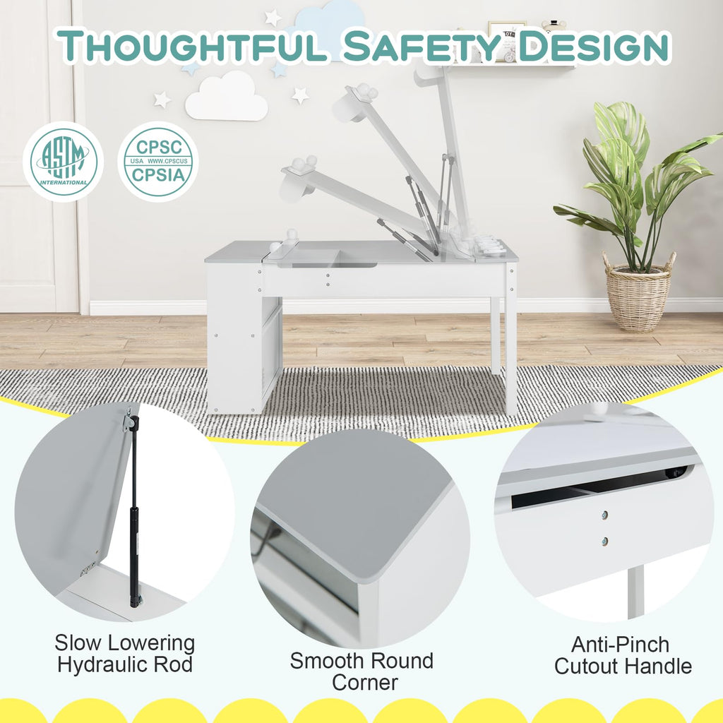 - [ Safety Protection ]: This wooden kids activity table set is ASTM and CPSIA certified to bring parents peace of mind. Thoughtful safety design of slow lowering hydraulic rod and cutout handle prevents your little one’s fingers from accidentally getting caught. Besides, smooth round corners prevent unexpected injuries.