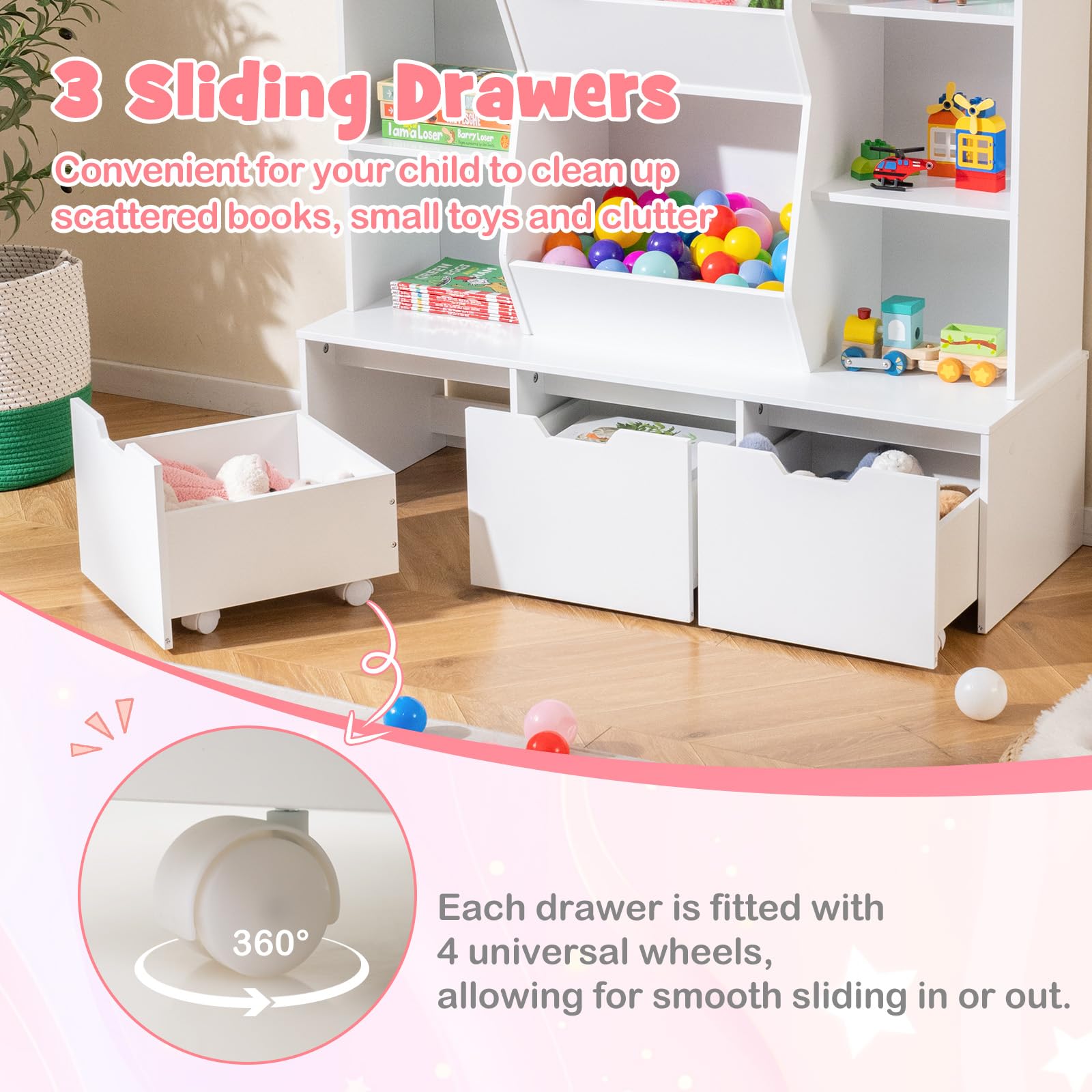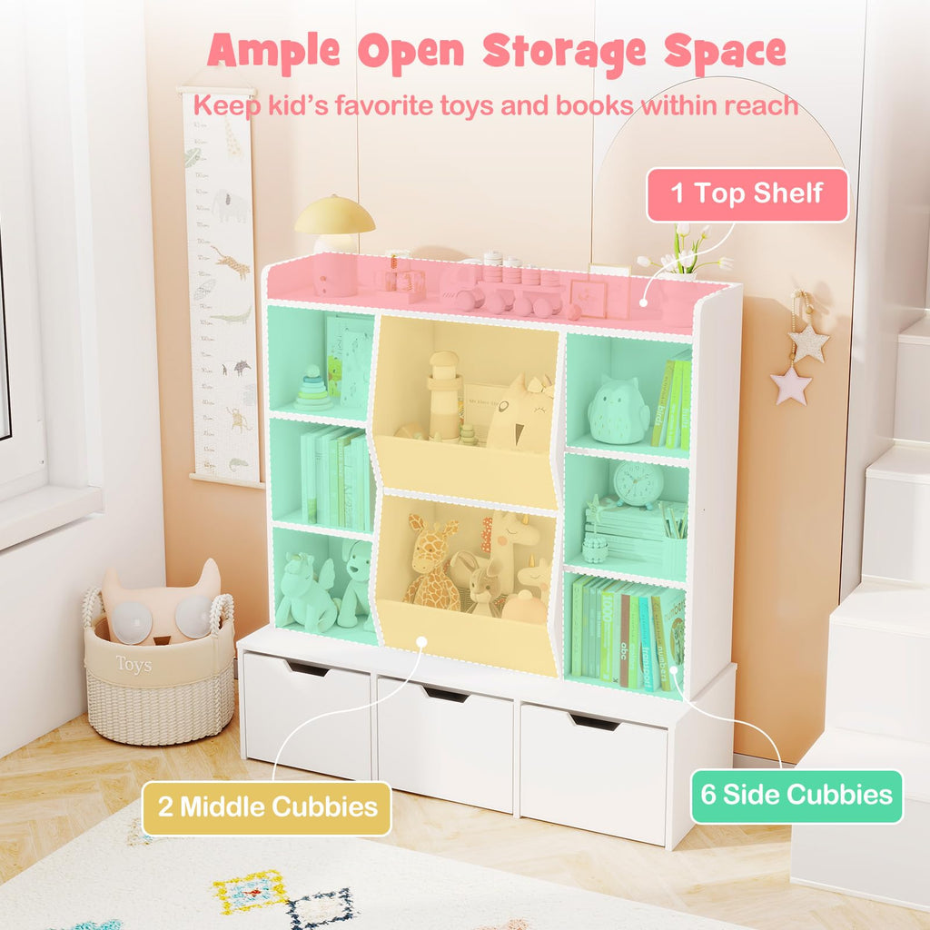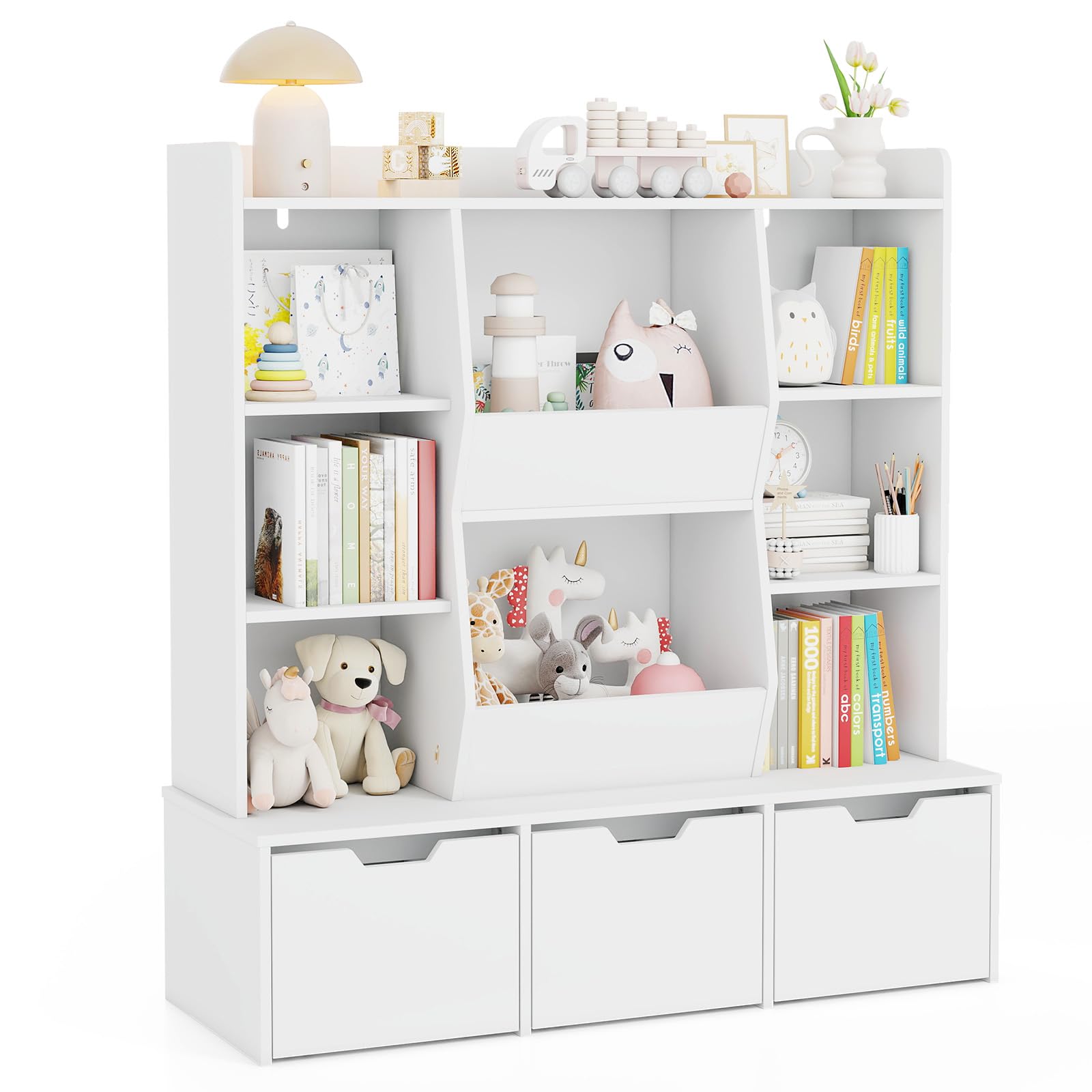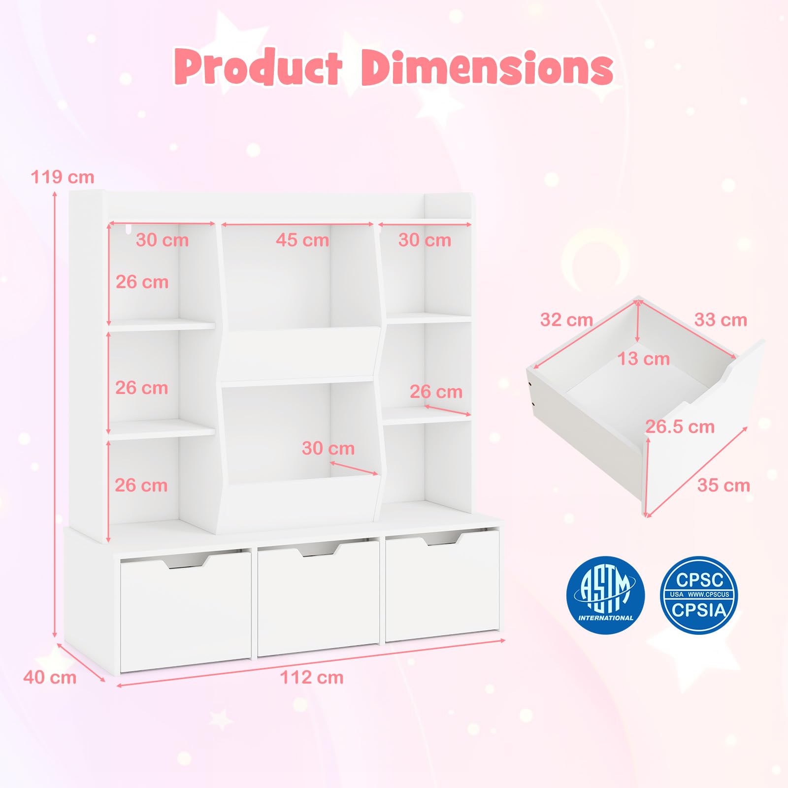Costzon 47" Toy Storage Organizer Large Kids Bookcase with 3 Movable Drawers & 8 Storage Cubbies