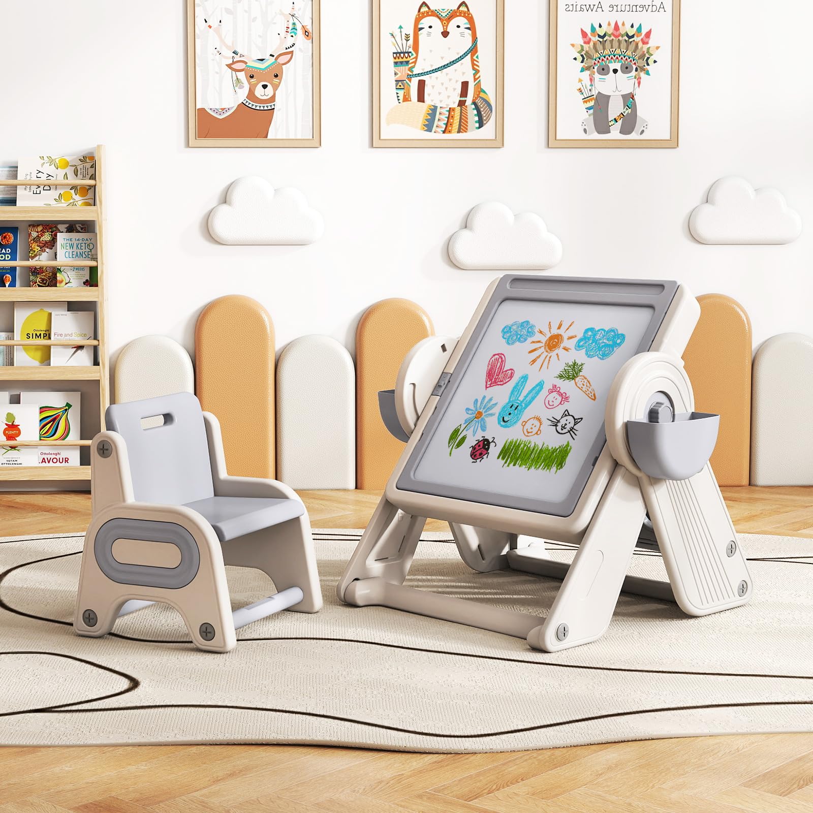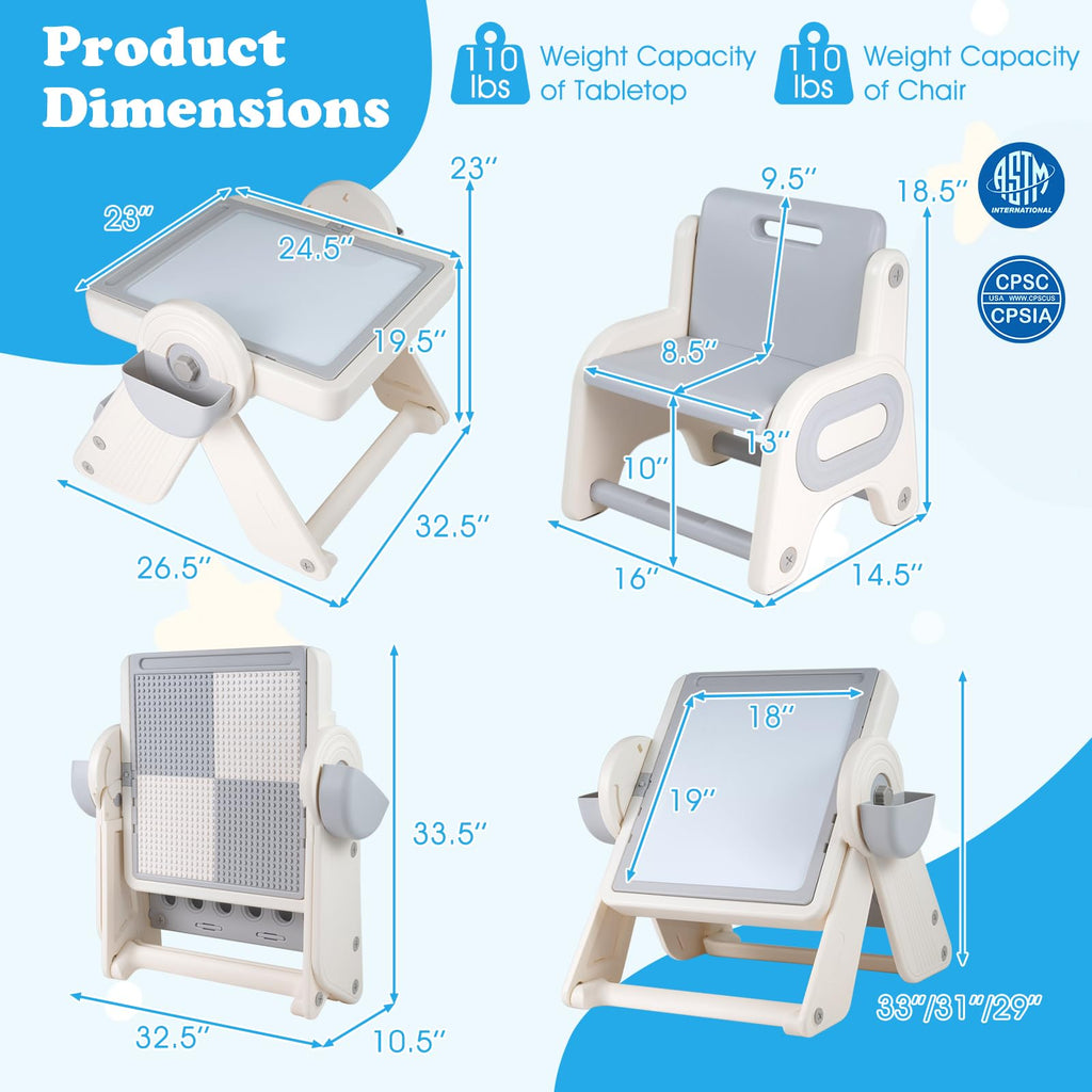 Costzon 6-in-1 Kids Table and Chair Folding Height-Adjustable Art Easel w/Reversible Building Block Tabletop & Whiteboard