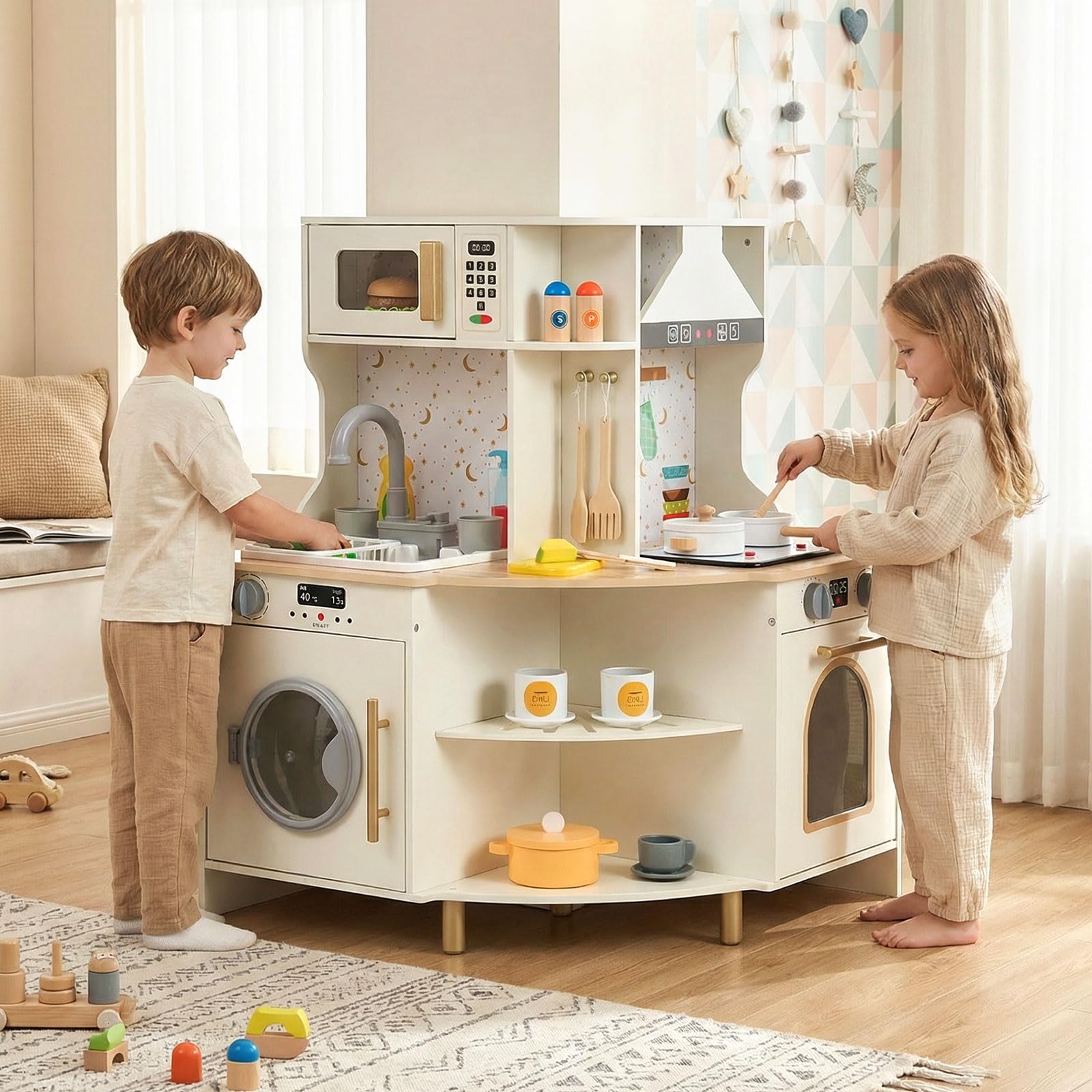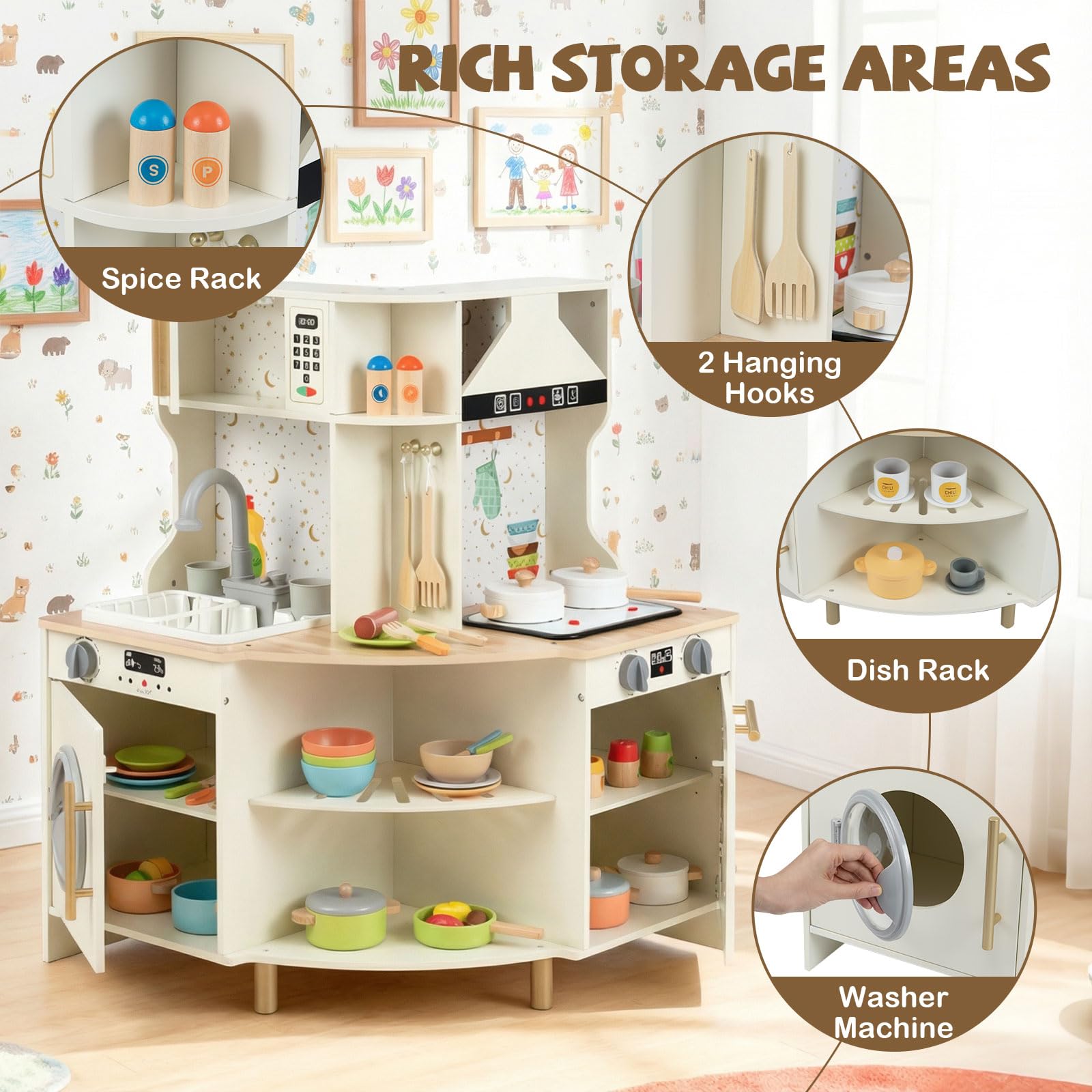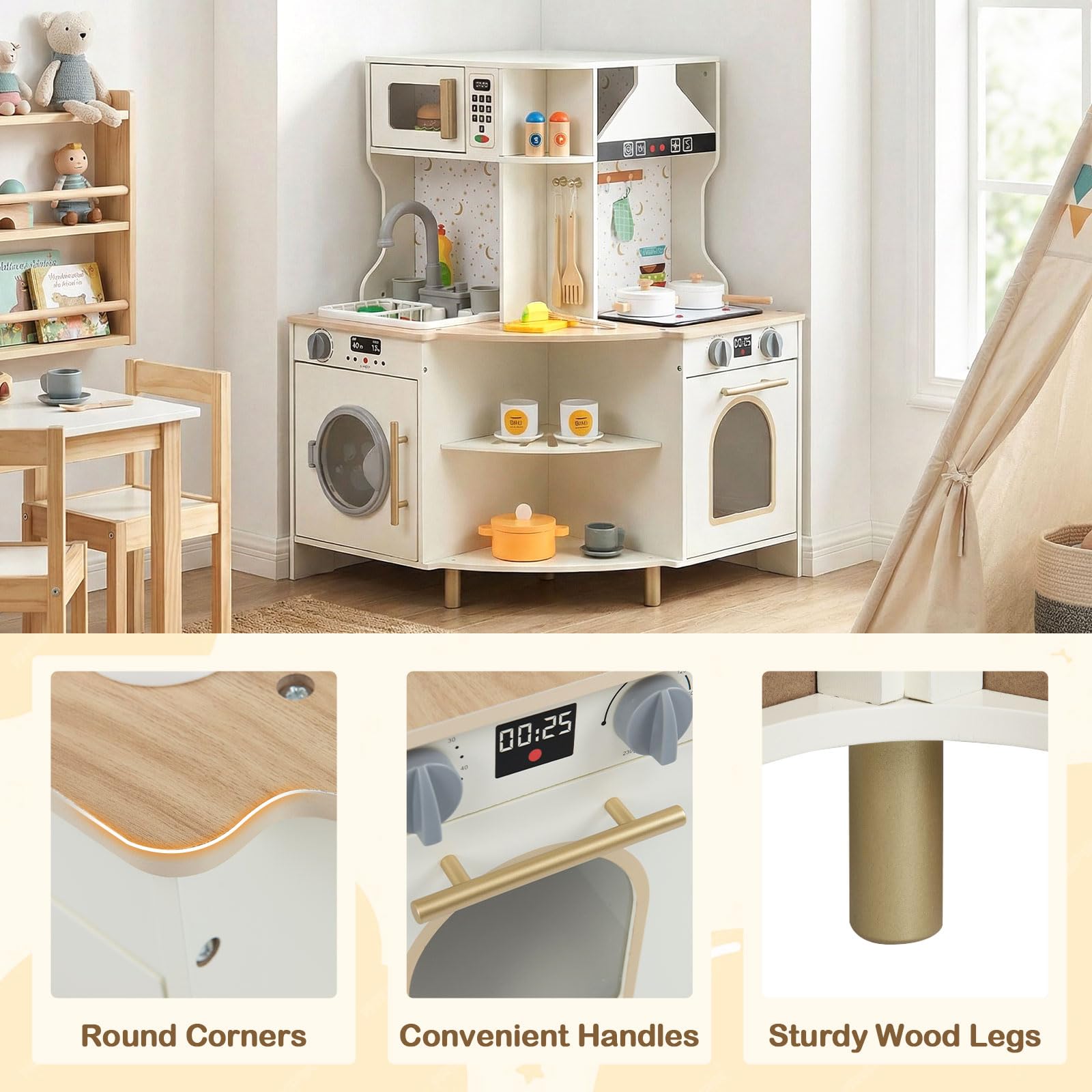 Costzon Corner Play Kitchen Wooden Toy Cooking Set