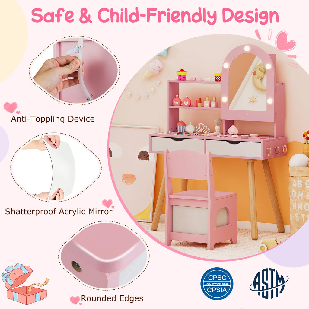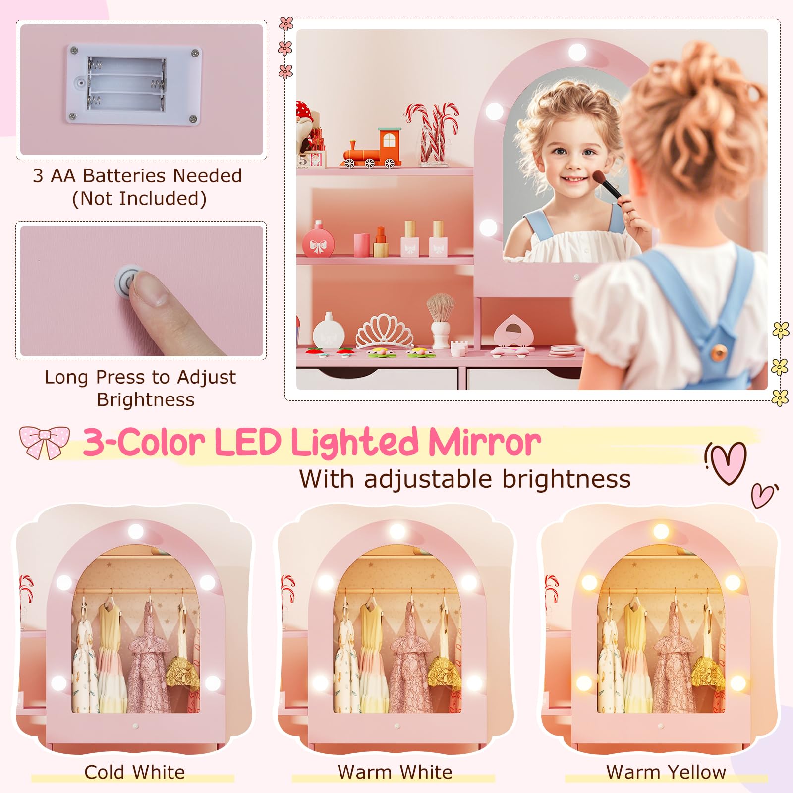 Costzon Kids Vanity with Lights Girls Vanity Set with Mirror Cabinet